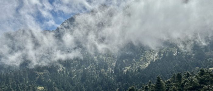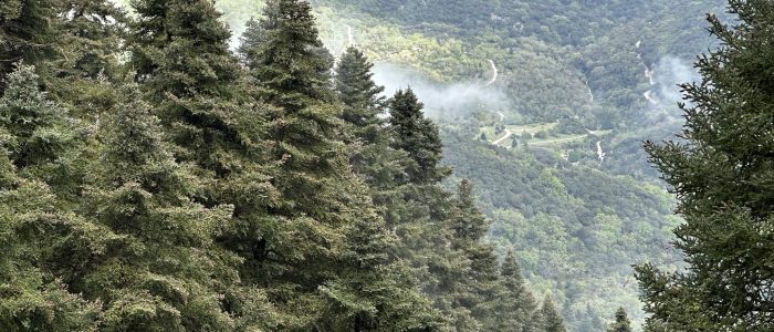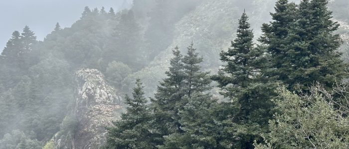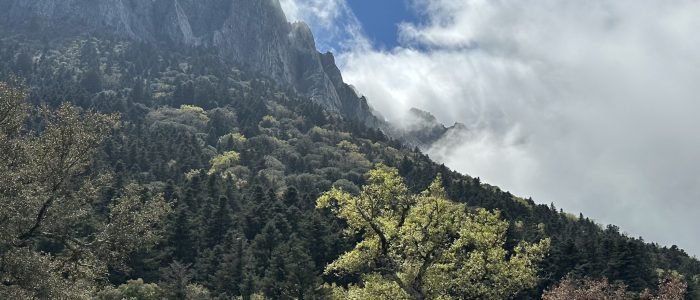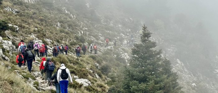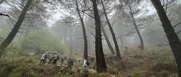 Y comenzamos el sendero con nuestra subidita ineludible y las nubecillas que entraban y salían, dando un toque diferente a este bosque de pinos. ¡Recuerdo esta ladera completamente pelada y tan solo con las plantas bajas y sin un solo árbol, que cuando lucía bien el astro vital se notaba el calorcito directo! En una subida armoniosa y refrescante, la serpiente asociativa de los componentes del grupo colorea el lugar… Y en unos cuantos zigzag, asomamos por el Puerto de las Cumbres, con el cielo nuboso y las vistas limitadas, pero el ambiente es único!!! Disfrutamos del vapor hídrico rozándonos… y esperamos para reagruparnos… Me comenta un compañero que la plantación de pinos de la subida que hemos realizado fue obra de un grupo del que su abuelo formó parte…!!!